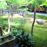 四方正面の庭「潮音庭」の法堂の三尊仏に見立てたという三尊石。高雄の景石が使われています。右に座禅石、紅葉などの植栽があるスギゴケの苔庭。